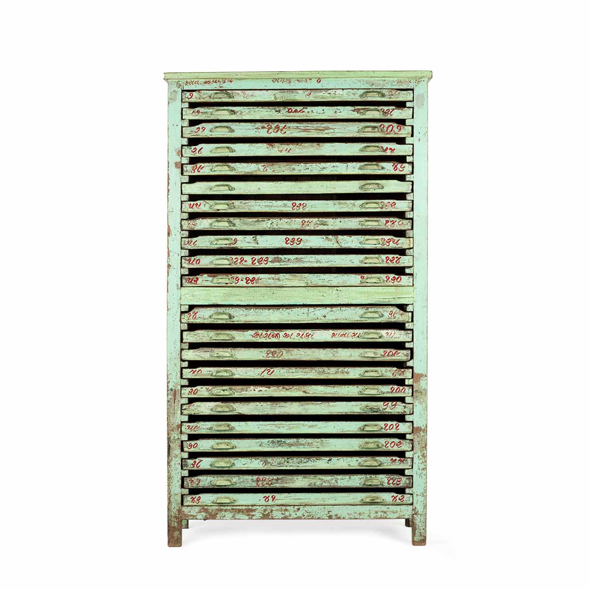 Multi-drawer cabinet in beautiful aged green tones. Antique wooden multi-drawer furniture to exhibit pieces in shops and stores or simply to decorate the space with the charms of the past.